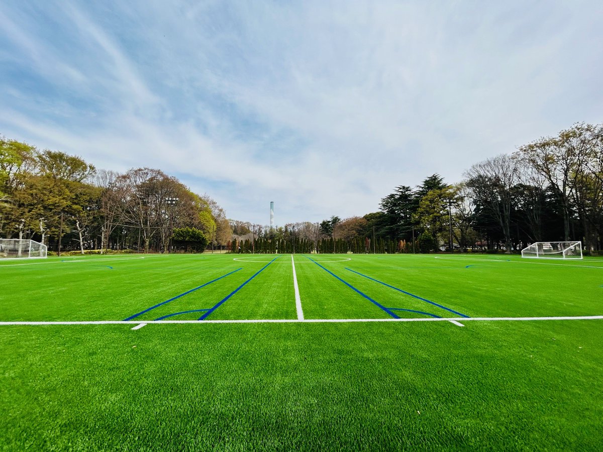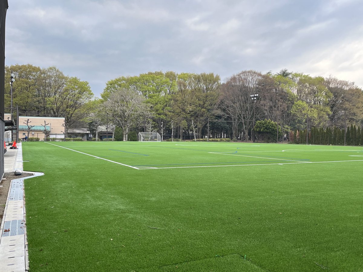 砧公園には小サッカー場もあり、子ども達がサッカーを楽しめる場所になっています。以前は土のグラウンドでしたが、とってもきれいな人工芝に生まれ変わりました。