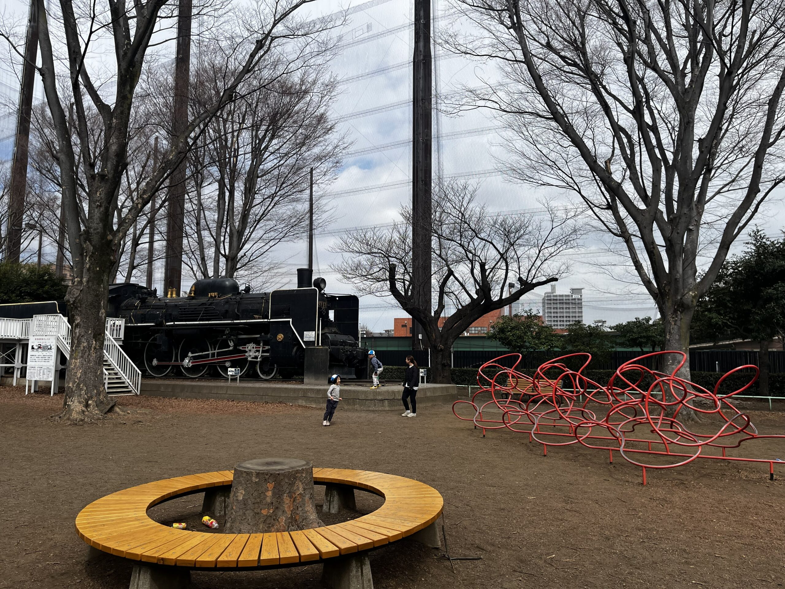 道路を挟んで反対側には大蔵運動公園というまたまた大きな公園があります。 こちらはゴルフやテニス、陸上、プールなど、様々なスポーツが楽しめます。 また、SLや魅力的な遊具なども多数あり、とても楽しい公園です。 道路を一本挟むとまた大きな公園があり、一日では遊びきれないくらい広く素敵な公園です。