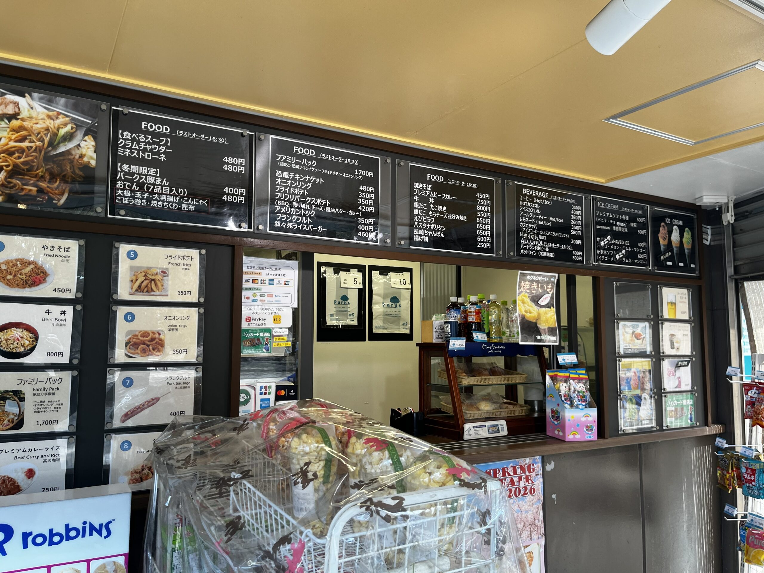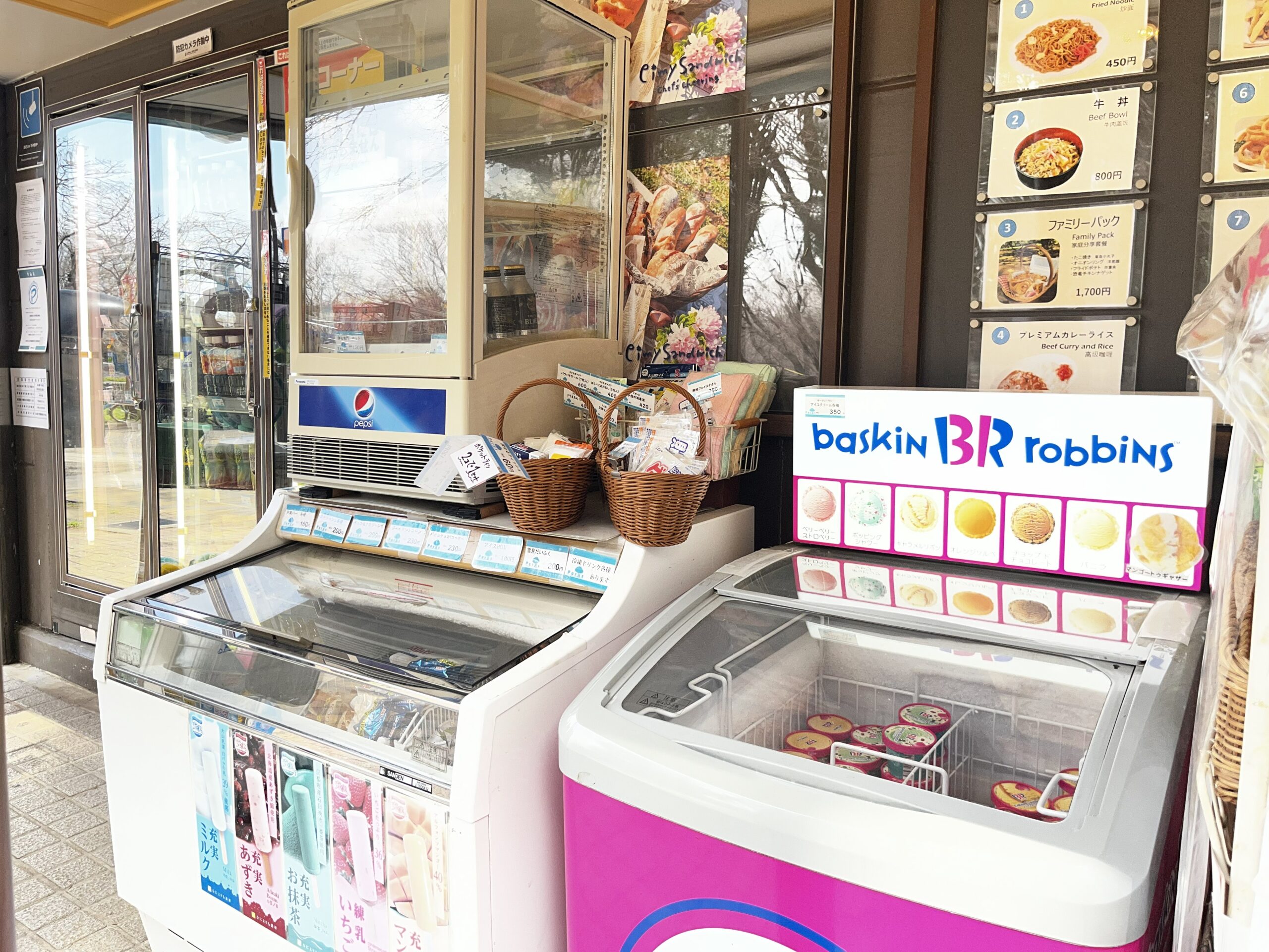 サーティーワンのアイスクリームやソフトドリンク、軽い食べ物などが販売されており、公園で遊んだあとに休憩するのに最適です。また、公園内で遊ぶグッズも販売しております。ほかにも、各所に自動販売機がありますのでご安心ください。